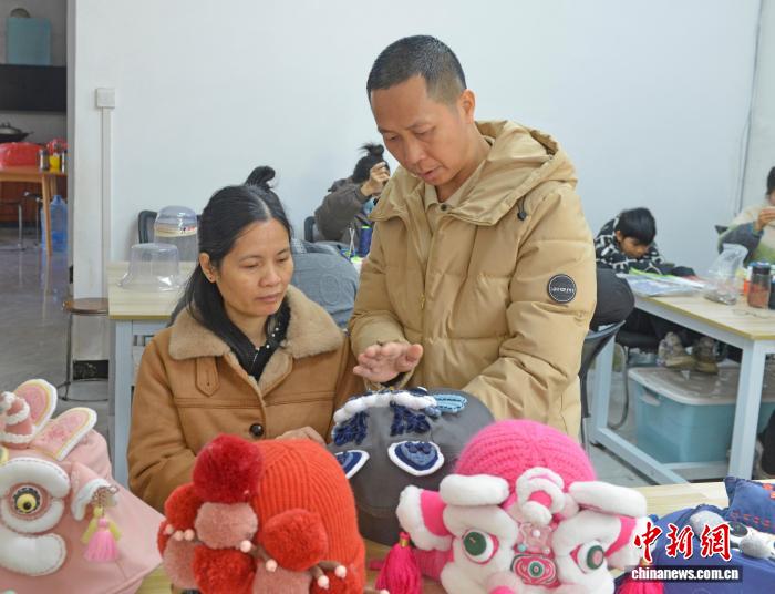 12月14日,何继文(左)正正在查抄工人绣美的产物。滕忠 摄
